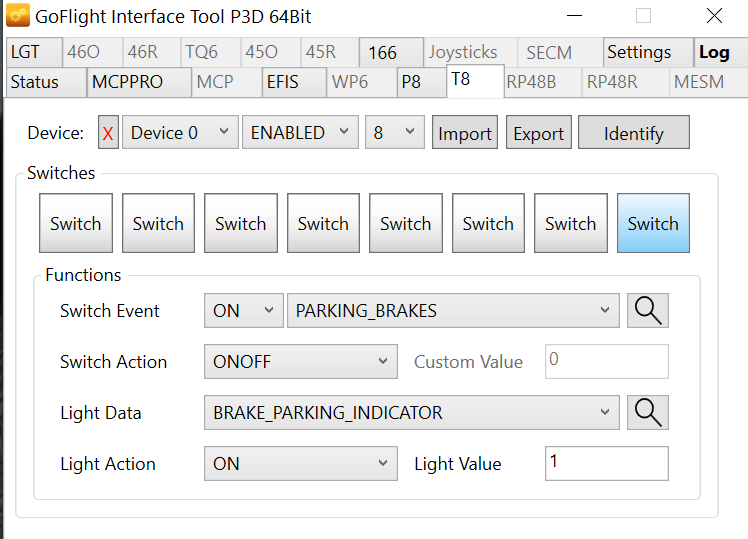 I have a T8 unit on which I have assigned OHD BAT SWITCH to a switch. I can switch it on and off and the LED indicates correctly. However, if I operate the P/Brake via another switch on the same module the Battery LED goes off and does not return even after changing the status of the P/B. What is causing this? The P/B is programmed via the GoFlight interface, not GIT.