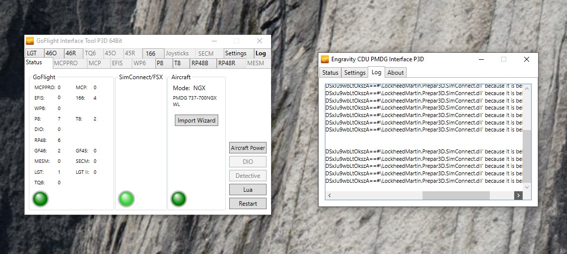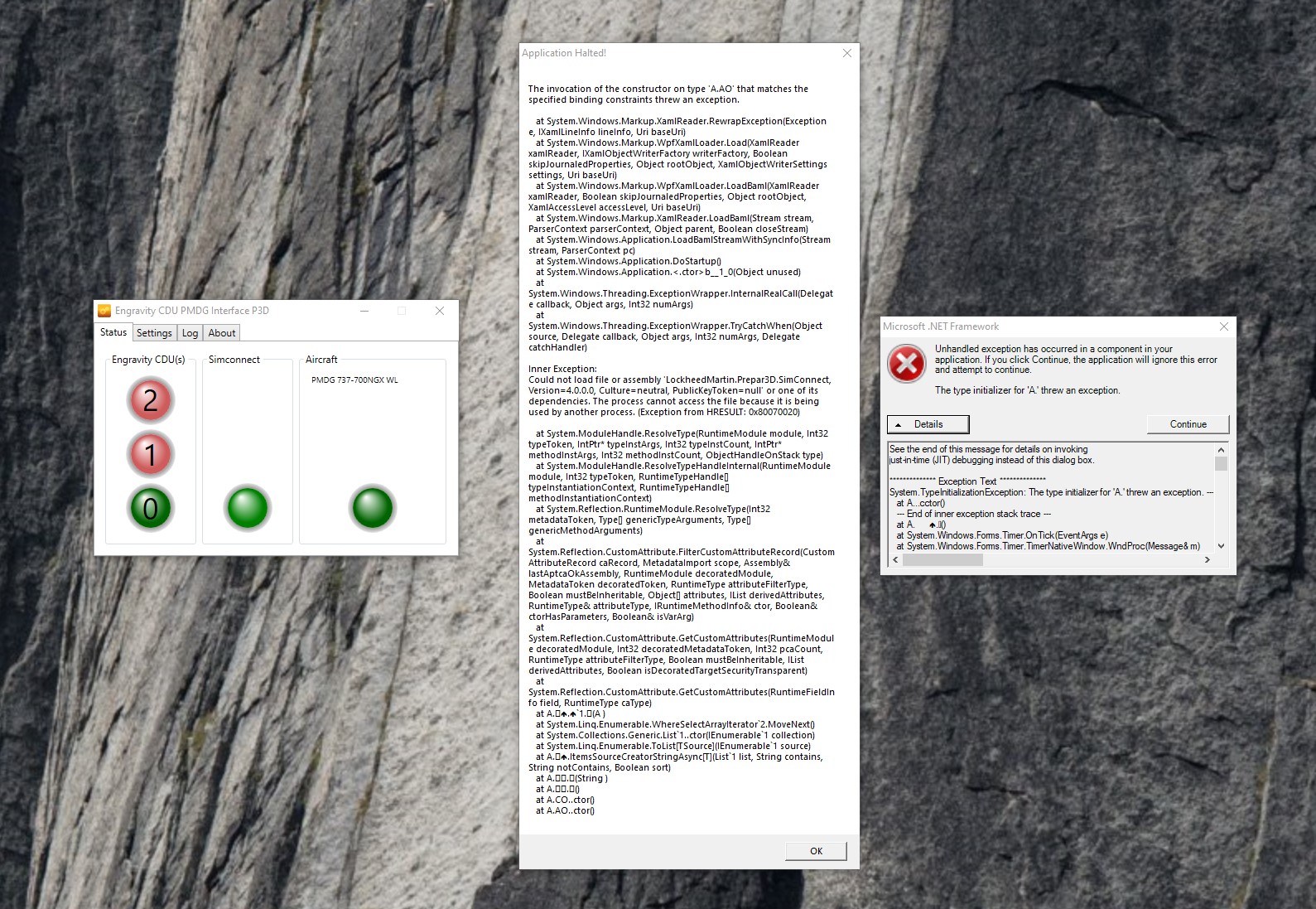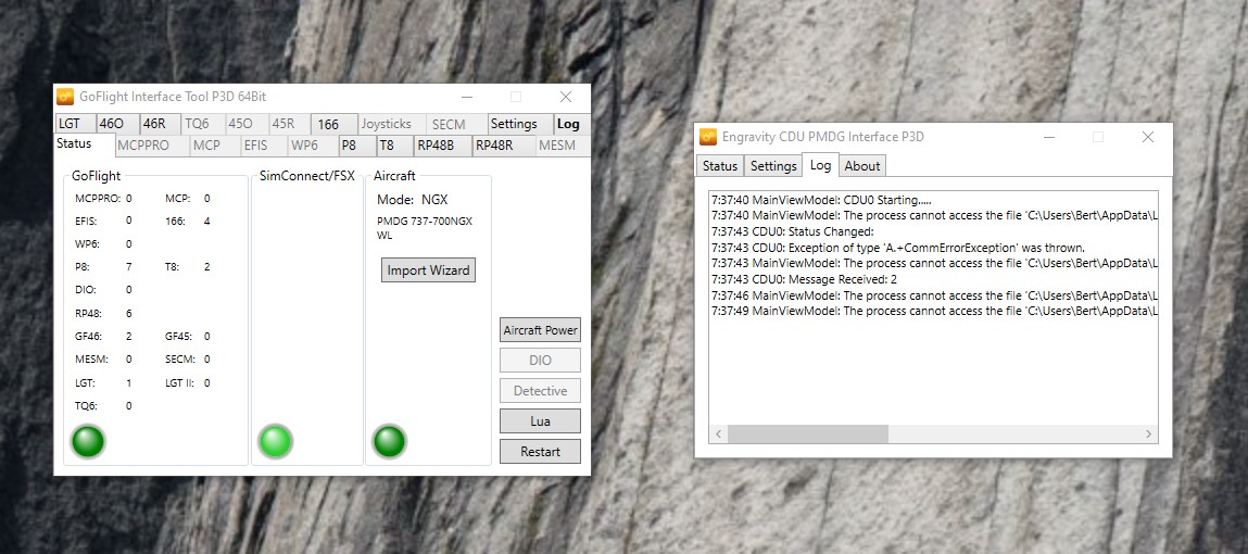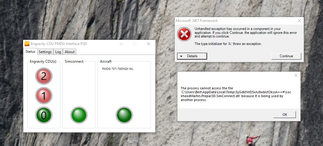 If on the other hand I first start the Engravity CDU PMDG it works fine ('three green', I can use the CDU), but after starting GIT I get several message boxes with lots of errors; the main error seems to be 'The process cannot access the file 'C:\Users\Bert\AppData\Local\Temp\SyGdktWDSxJu9wbLtOksza==£LockheedMartin.Prepar3D.Simconnect.dll' because it is being used by another process' I assume the "another process" is the Engravity CDU PMDG, but they worked fine under FSX.