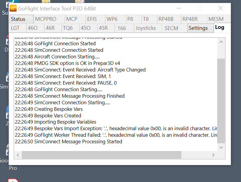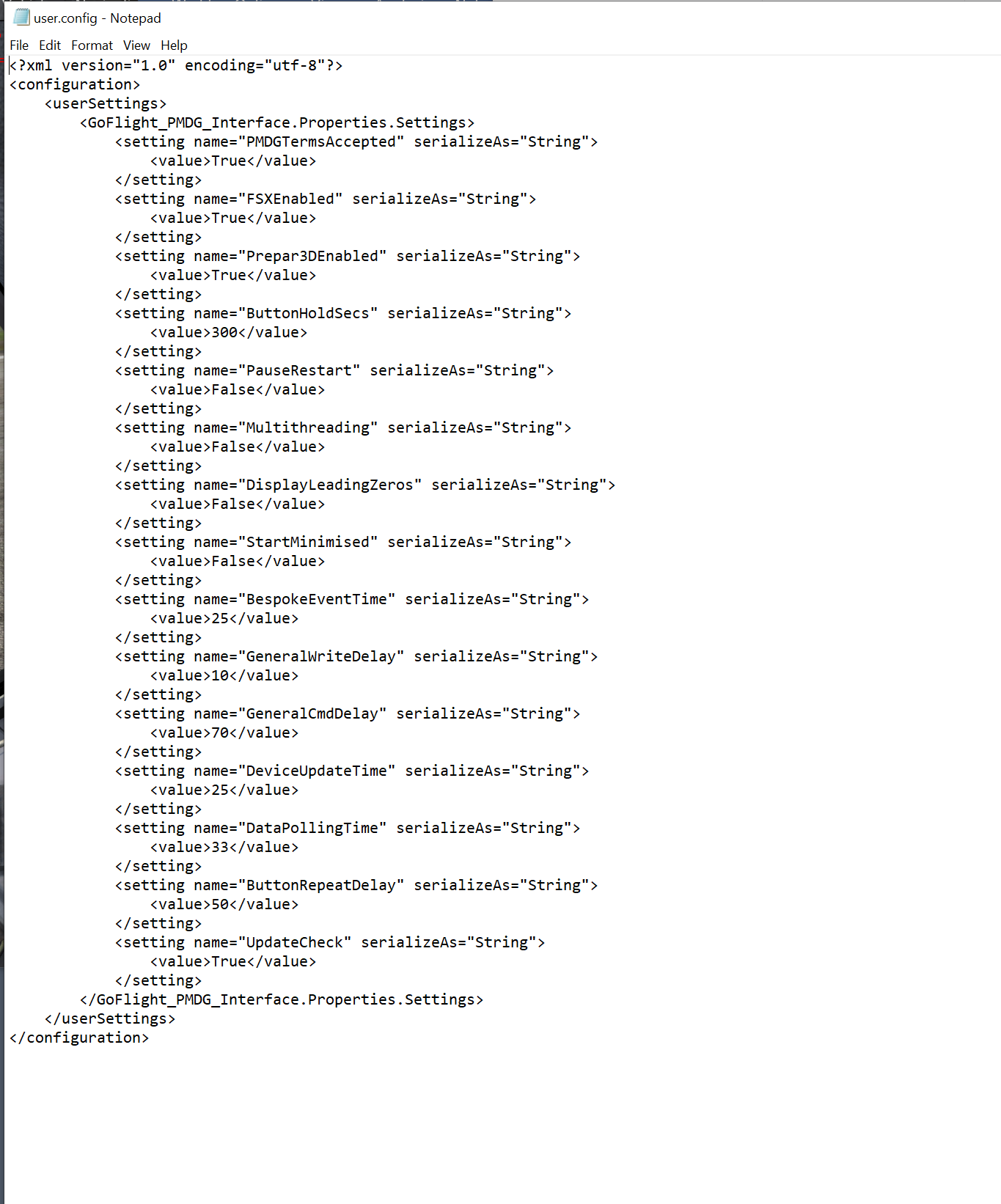 • An XML file is corrupt. Try deleting C:\Users\\AppData\Local\PollyPot_Software. If that doesn't work, restore from backup Documents\GoFlight Interface Tool. If you don't have a backup, you can try restoring the files from Documents\GoFlight Interface Tool\Backup; renaming the files as necessary. If all that fails, delete Documents\GoFlight Interface Tool and prepare to configure everything again.