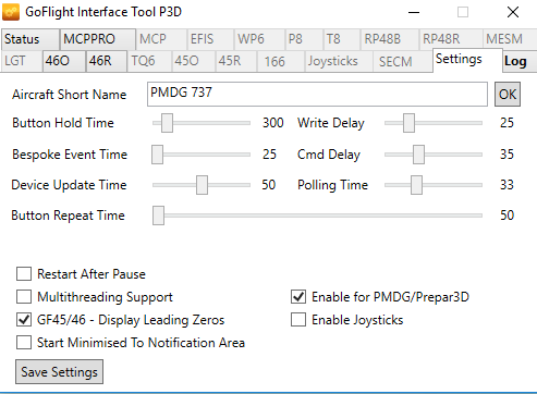 Hi, I am using your Goflight interface tool for driving MCPPro and GF46 with the last version of Prepar3D and PMDG 737 NGX.