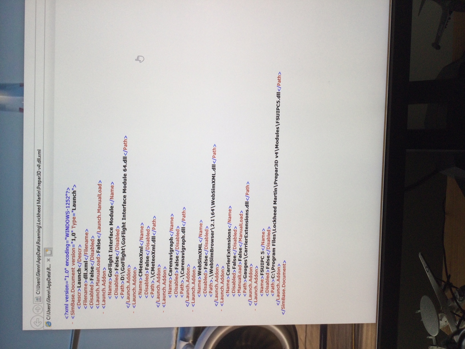 There only appears to be one such entry in dll.xml. Picture attached. Incidentally, in that folder there are three files I’ve never noticed before: dll.xml.GIT0, dll.xml.GIT1, and dll.xml.GIT2. Assuming those should be there. I tried unplug/replugging in hardware this morning and for the first time got the MCPPRO tab to “un-gray”. I enabled device 0 in that tab but nothing responded. Also, only one EFIS panel “un-grayed” and also didn’t respond. The other EFIS panel and LGT ll did not. In both cases above, no switches or knobs worked. Oddly enough, the same excercise yesterday got everything working EXCEPT the MCPPRO. No consistency.