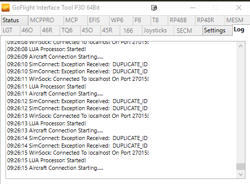 Thanks to SPADNext being a constant pain in my side, I'm forever reinstalling it. Finally got it to work, but it's 'knocked out' my GIT software somehow - only explanation as it was working perfectly fine before reinstalling it after 'fixing' SPad. I have only dashes in my displays in the MCP and both MCP and EFIS greyed out in the interface. I've attached a log - any ideas?