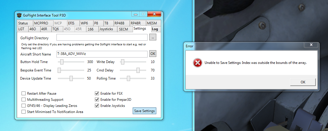I just tried to enable joysticks and when I tried to save I got the error as shown in the attached clip. I restarted GFIT and when I close I get the same error. The log entry I get When trying to save settings are