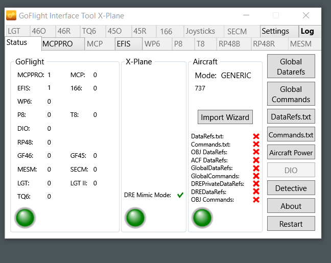 I have the Interface Tool Running for Xplane. I attached some images that might help.The display is NOT lighting up nor is the EFIS working. I know they both work because they work when I am using PrePar3D